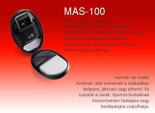 A Sony Ericsson januárban mutatta be a MAS-100 aktív kihangosítót a W760 Walkman mobillal együtt. A zenei tartozék elsősorban az aktív életstílus kedvelőinek készült, hiszen a homok és vízálló zenei tartozék hordtáska is egyben, vagyis nem csak kihangosítóként funkcionál, de védi is a telefont. A hangszórót a telefonhoz a táska belsejében elhelyezett kábel segítségével lehet csatolni, melynek meghosszabbított része antennaként is funkcionál, így akár rádióhallgatásra is használható. A sportos kivitelű 154x84x44 milliméteres tartozék sárga és ezüst színekben kerül a boltok polcaira.