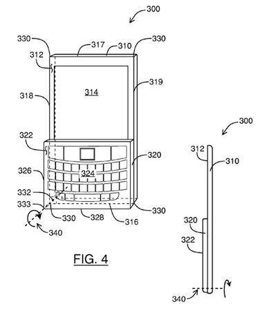 Egy 2010-es szabadalmi beadvány szerint a Research In Motion olyan készüléket tervezett, mely a hardveres QWERTY gombos és a hatalmas érintőkijelző előnyeit próbálta egyesíteni. A megoldás lelke egy zsanérral rögzített billentyűzet lehet, mely normál esetben a megjelenítő alsó részét kitakarta ugyan, ám igény szerint teljes egészében a készüléktest mögé is hajtható, de akár rögzítőkarként is funkcionálhat a több fix állásának köszönhetően. A megoldásról sokaknak a jó öreg Sony Ericsson P800 juthat eszébe, ám ott a billentyűzetet nem lehetett hátra hajtani, cserébe viszont teljes egészében eltávolítható volt. A Motorola Flipout is egy hasonló „alakváltó” szerkezet, ám az amerikai gyártó négyzetes üdvöskéjénél a billentyűzet a készülék alól a jobb alsó sarok mentén forgatható ki.