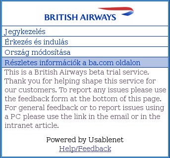 A British Airways elindította az online check-in szolgáltatásának mobilos változatát, mely tizenegy nyelven, köztük magyarul is elérhető lesz. Az online jegykezeléshez nem kell ezentúl számítógép elé ülni, hanem mobilon is megoldhatóak a szükséges műveletek. A rendkívül egyszerű felépítésű oldal egyelőre még nem készült el teljes pompájában, magyarul például még csak a kezdőlap „beszél”, de a tesztüzem végére várhatóan teljeskörűen elérhetőek lesznek a British Airways szolgáltatásai. Az ingyenes szolgáltatás elérése mobiltelefonos böngészőn a ba.com/mobile webcímen lehetséges.