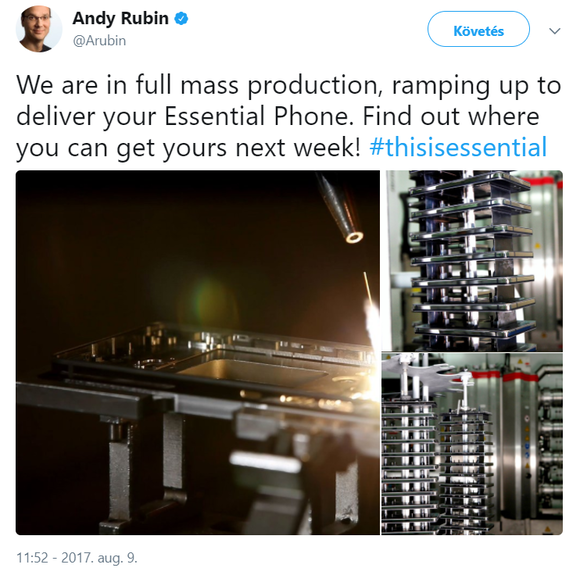 Andy Rubin ismét nyilatkozott, és ismét nem sikerült semmi konkrétummal szolgálni az Essential PH-1 elérhetőségére vonatkozóan. Legutóbb néhány hetet irányzott elő, ami szintén nagyjából most esedékes, ehhez képest még mindig csak a tömeggyártás megkezdését jelentette be Twitteren. De az legalább teljes kapacitással folyik, azzal együtt, hogy ismét kihangsúlyozták, az Essential készüléke nem tömegterméknek készül. Viszont azt továbbra sem lehet tudni, hogy a megrendelt készülékek mikor kerülnek a vásárlókhoz.