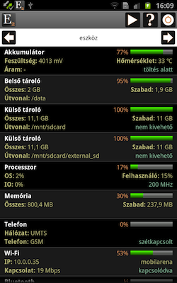 Kezdjük a monitorozási lehetőségekkel! Az Információ menüpontban az eszközzel és az operációs rendszerrel kapcsolatos adatokat találjuk. Nem egy egyszerű, a processzor órajelét és a memória mennyiségét nyilvántartó alkalmazást kell elképzelni, ehelyett a lehetőségek egész tárháza fogad minket. Megnézhetjük például, hogy mit tartalmaz a vágólap és mi az aktuális IP-címünk, de akár a WiFi-kapcsolatunk adatait és a környezeti változókat is kilistázhatjuk. Az egyes menüpontokat megérintve pedig azok részletes nézete is megtekinthető, ahol tényleg mindent megtalálunk az adott modulról. Megnézhetjük például a java rendszerváltozókat, kilistázhatjuk a megosztott programkönyvtárakat, valamint akár az akkumulátor aktuális hőmérsékletéről és feszültségéről is tudomást szerezhetünk.