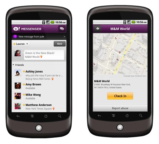 Elkészült az Android-alapú eszközökre szánt Yahoo! Messenger legújabb változata, mely az új funkciók széles tárháza helyett csupán a kisebb hibajavításokra és a pillanatnyi tartózkodási hely kényelmes megosztására fókuszál. Ez utóbbi segítségével a jövőben egyetlen gombnyomással, a Google Maps nélkül is lehetőség nyílik a földrajzi koordináták üzenetbe történő beágyazására. A Yahoo! új csevegőszoftvere továbbra is ingyen érhető el a Google Play Store, vagyis korábbi nevén az Android Market online piactéren.
