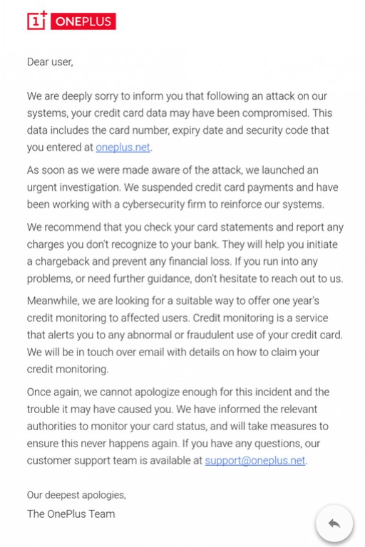 Január 19-i közleményük alapján a OnePlus rendszerét érte támadás, amelynek következtében nagyjából 40 ezer felhasználó bankkártyaadatai, mint kártyaszám, a lejárat dátuma és a biztonsági kód (CVC/CVV), kerültek illetéktelen kezekbe. A bankkártyás fizetés lehetőségét természetesen azonnal megszüntették az oldalon, javasolják, hogy a potenciális érintettek rendszeresen ellenőrizzék a kártyatranzakciókat és bármilyen gyanús pénzmozgás vagy kísérlet esetén lépjenek kapcsolatba a bankkal. Ez vonatkozik mindazokra, akik 2017 november közepe és 2018 január 11. között bankkártyával vásároltak a OnePlus webshopjában. A gyártó kifejezte legmélyebb sajnálatát az incidens miatt, bármilyen probléma esetén a support@oneplus.net e-mail címre várják az észrevételeket.
