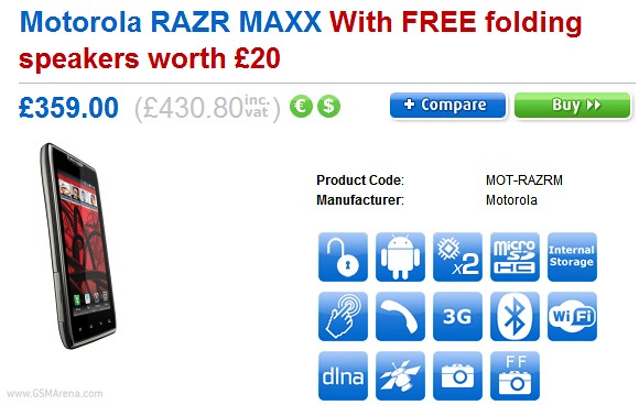 Az Egyesült Királyságban elsőként a Clove vette fel kínálatába a Motorola RAZR Maxx készüléket, mely előrendelési ára bruttó 430 angol font, azaz nagyjából 154 000 forint körül alakul. A várhatóan május közepén kiszállításra kerülő alapcsomagban egy összehajtható MOTOROKR EQ3 vezetékes hangszórót is helyet kapott, mely segítségével bárhol hangosan szólhat a zene. A 4G LTE hálózati támogatás nélkül ékező 130,7x68,9x9 milliméteres és 145 grammos Motorola RAZR Maxx 4,3 hüvelykes, 540x960 képpontos Super AMOLED Advanced érintőkijelzőt, 1080p felbontású HD anyagok rögzítésére alkalmas 8 megapixeles fő és 720p videóhívások lebonyolítására alkalmas 2 megapixeles előlapi kamerát, GPS, WLAN (802.11b/g/n) és Bluetooth 4.0 modult, HSPA+ adatátviteli képességet, 1,2 GHz-es kétmagos processzort, 1 GB RAM-ot, 16 GB belső tárhelyet, microSDHC kártyafoglalatot, HDMI kimenetet, FM rádiót és 3300 mAh kapacitású akkumulátort kapott.