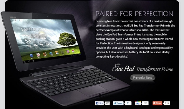 Az Asus korábbi beharangozójának megfelelően egyes régiókban már novemberben megkezdődött a Transformer Prime előrendelése, melyet jövő hónapban a piaci premier is követni fog. A 32 és 64 GB-os változatban piacra kerülő táblagép ára nettó 499 és 599 dollár, azaz hazai áfát feltételezve 145 000 és 174 000 forint körül alakul, mely nem tartalmazza a 6 órányi üzemidőt, teljes méretű USB csatlakozot és SD foglalatot tartalmazó QWERTY dokkoló árát. A mindössze 8,2 milliméter vastag és 585 grammos Transformer Prime 10,1 hüvelykes, Gorilla Glass üveggel védett, 1280x800 képpontos Super IPS+ megjelenítőt, 1080p felbontású HD anyagok rögzítésére alkalmas hátoldali és 1,2 megapixeles előlapi kamerát, SonicMaster hangrendszert, 1,3 GHz-es négymagos Nvidia Tegra 3 processzort, 1 GB RAM-ot, microSDHC kártyafoglalatot, microUSB és microHDMI csatlakozót, valamint 12 órányi üzemidőt biztosító akkumulátort kapott.