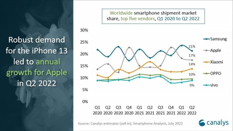 A Canalys második negyedévre vonatkozó adatai alapján a mobileadások nemzetközi viszonylatban 9%-kal estek vissza, de a piacvezető Samsung és a mindeddig harmadik helyet birtokló Apple azért fel tud mutatni némi növekedést az elmúlt évben. Mindkét piacvezető gyártó 3%-os növekedést produkált a tavalyi megegyező időszakhoz képest, rajtuk kívül minden toplistás brand eladásai visszaestek, így csúszott vissza a Xiaomi a harmadik helyre. Az Apple pozícióját egyértelműen az iPhone 13 széria népszerűsége mozdította felfelé, míg az alsóbb kategóriákban egyéb tényezők is közrejátszottak a visszaesésben.
