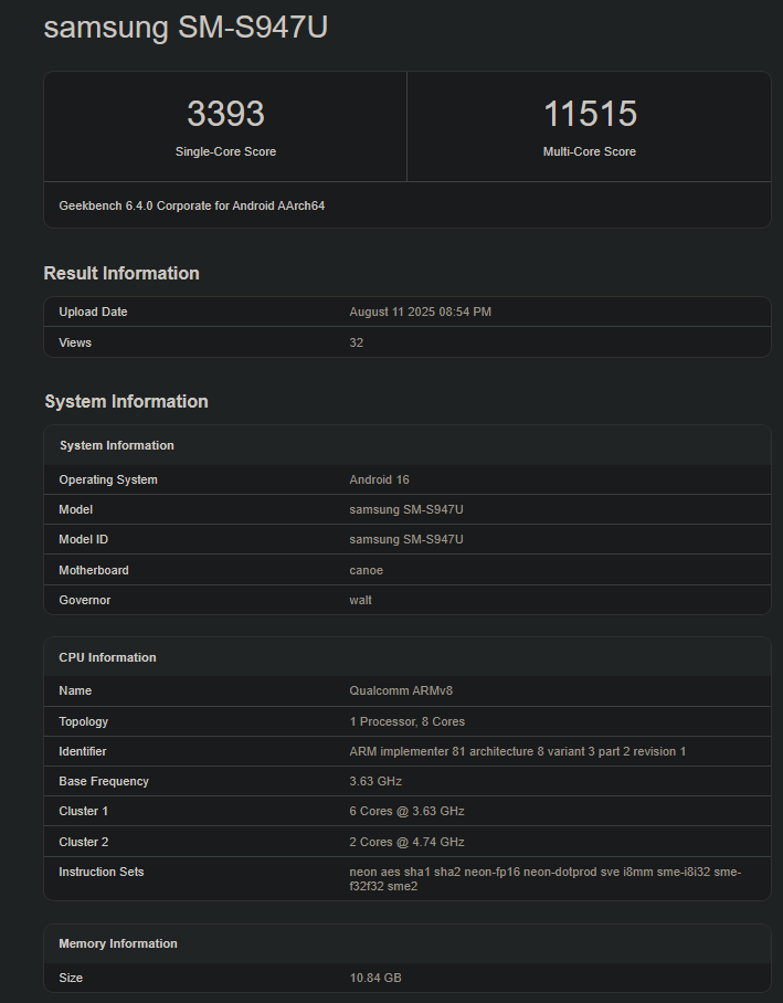 A Geekbench 6.4-es tesztet egy SM-S947U kódnév alatt futó készülék teljesítette, ebből egy Samsung eszközre lehet következtetni, méghozzá a Galaxy S26 Ultrára vagy Edge-re. Így szinte biztos, hogy a Snapdragon 8 Elite 2 For Galaxy változatáról van szó, ám a teszt eredményei szerint a CPU nem a teljes 4,74 GHz-es kihasználtságon futott, csupán 4 GHz-re skálázva. Így ért el 10%-kal magasabb eredményt a Snapdragon 8 Elite-nél egy- és többszálas teljesítményben is 3393 és 11 515 ponttal zárva.