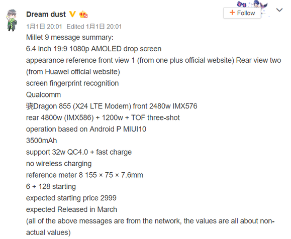 A megjelenítő a OnePlus 6T.hez hasonlóan 6,4 hüvelykes, cseppszenzoros, FHD+ felbontású AMOLED panel lehet, egy 24 megapixeles Sony IMX576-os szelfikamerával. Méreteit tekintve a készülék 155 x 75 x 7,6 milliméteres, amibe egy 32 wattos, Quick Charge 4+ szabvány szerint tölthető 3500 mAh-s akkumulátor kerül, vezeték nélküli töltés lehetősége nélkül. A Snapdragon 855-tel és alapcsomagban 6/128 GB memóriával szerelt modell márciusban várható Android 9-es alapokra épített MIUI 10-zel, 123 ezer forintnak megfelelő kezdőáron. Mindezek alapján a bemutatót valószínűleg az MWC-re időzítik.
