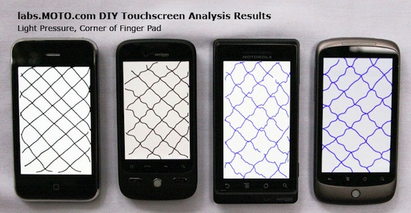 A CES alkalmával egy egyszerű teszt került bemutatásra, mely segítéségével bárki ellenőrizheti a érintőkijelzőjének pontosságát. Ehhez nem kell semmi más csak egy rajzolóprogram, mely megnyitása után lassú, de határozott mozdulatokkal, a megjelenítő oldalra 45 fokos szöget bezáró vonalakat kell ujjal felrajzolni. Ha az eredmény olyan egyenletes, mint az alant látható képen az iPhone esetén, akkor az érzékelés kellően pontosnak tekinthető. Ha a vonalakon szabályos kilengések figyelhetőek meg, akkor várhatóan gépelés és linkek kiválasztása során is nagyobb pontatlanságra lehet számítani, mint az alábbi fotón a Droid Eris, Droid/Milestone és a Nexus One esetén.