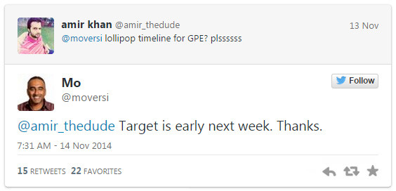 A HTC egyik munkatársa legalábbis erről számolt be twitteres csatornáján, konkrétan a hét első felét megnevezve. Azt egyelőre nem tudni, hogy Mo Versi csak a két HTC-s GPE modellre gondolt (a One M7 és a One M8-nak is létezik nyers androidos változata), avagy minden GPE-s típusra, mindenesetre a kezdeti nyalókahiány után úgy tűnik, hogy a magas cukortartalmú rendszerfrissítés lassan megérkezik mindegyik hivatalos és félhivatalos referenciamodellre.