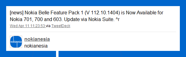 A Nokia ázsiai részlegének hivatalos Twitter oldalán olvasható bejelentés szerint a Nokia 701, 700 és 603 modellek számára megkezdődött a Belle FP1 szoftverfrissítés leszállítása, mely többek között a processzor órajelét is 1,3 GHz-re húzza. A fotózásra kiélezett PureView 808 készülékkel együtt leleplezett új platform a Dolby Digital Plus és Dolby Headphone támogatás mellett javított böngészőt és 20 widgetet is kínál, melyen túlmenően apróbb javításokra és optimizálásokra is számítani lehet. Egyelőre nem tudni, hogy a Nokia Belle Feature Pack 1 Ázsián kívül is elérhető-e, mint ahogy a lassabb processzorral szerelt, előző generációs Symbian^3 modellek frissítéséről sem esett szó.