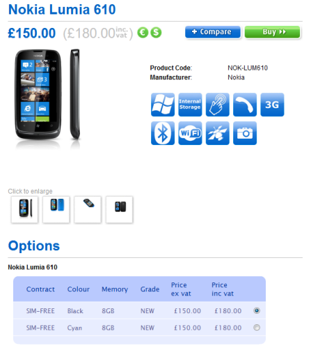 A Nokia korábbi közleményének megfelelően az indiai premiert követően Európában is piacra kerül a Windows Phone termékpalettájának legolcsóbb készüléke, mely az Egyesült Királyságban már a jövő hét elejétől kapható lesz. A brit Clove kínálatában 180 angol fontos, azaz nagyjából 66 000 forintos áron megjelenő jövevény Nokia Drive navigációs szoftverrel és korlátlan zenehallgatást biztosító Mix Radio streaming zenei megoldásokkal is rendelkezik. A 119x62x12 milliméteres és 131,5 grammos Lumia 610 3,7 hüvelykes, 480x800 képpontos kijelzőt, 5 megapixeles kamerát, 7,2/5,76 megabites HSPA átviteli képességet, 800 MHz-es egymagos processzort, 256 MB RAM-ot, 8 GB belső memóriát, 25 GB-os Windows Live SkyDrive online tárhelyet, valamint 10,5 órányi beszélgetési időt biztosító 1300 mAh kapacitású akkumulátort kapott.