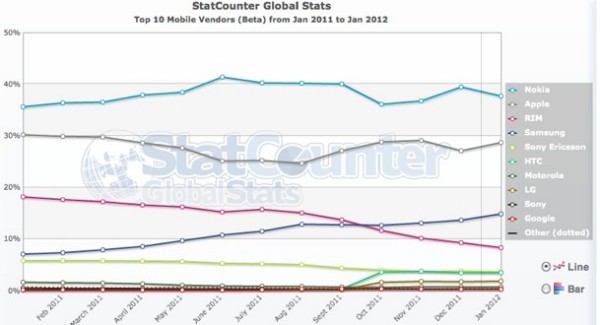 A StatCounter felmérése szerint a mobiltelefonos böngészők által generált adatforgalom 2009 óta minden évben duplájára nőtt és immáron az internetes forgalom 8,5 százalékát teszi ki, melyben jelentős szerepet töltenek be a Nokia mérsékelt árfekvésű megoldásai. A beszámoló szerint a Nokia mobil adatforgalmi részesedése 40 százalék körül ingadozik, mely elsősorban a kiemelkedően magas indiai népszerűségével magyarázható. A második helyen az Apple mobilja állnak 29 százalékos részesedéssel, míg a bronzérmes Samsung csupán a globális adatforgalom 14 százalékát tudhatja magáénak. A teljes Android flotta együttes részesedése nagyjából 25 százalékos lehet, míg a Research In Motion készülékei csupán a mobil adatforgalom 8,3 százalékát bonyolítják le. Nem szabad elfeledkezni arról, hogy a StatCounter kimutatása kizárólag a zsebben hordható eszközöket veszi számításba, vagyis a fenti számok nem tartalmazzák a táblagépek forgalmát.