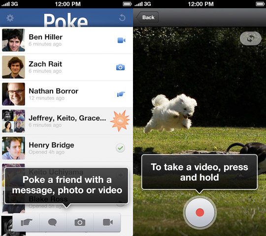 A Facebook Messenger és Camera után elkészült a népszerű közösségi oldal következő alkalmazása, mely a 2004-óra elérhető Poke, vagyis böködés szolgáltatást ülteti át a mobil eszközök világába. Az iOS-alapú készülékekre szánt alkalmazás segítségével 1, 3, 5 vagy 10 másodpercig látható képek, rajzok vagy videók küldhetők át az ismerősöknek, melyek az időkorlát lejárta után végleg törlésre kerülnek. A csatolt üzenetekről a böngészőkből elérhető felület is értesítést küld, ám azok megnyitása kizárólag a mobil alkalmazás segítségével lehetséges, melyhez a címzettnek csupán a megjelenítőn kell tartani az ujját. Az elküldött képekről képernyőmentések készítése sem lehetséges, mivel ennek megkísérlésekor a kliensszoftver azonnal törli az üzentet, illetve a feladót is értesíti az ez irányú próbálkozásról. A Facebook Poke iOS-alapú készülékekre szánt változata kizárólag az Apple App Store online piactérről tölthető le az alábbi linken.