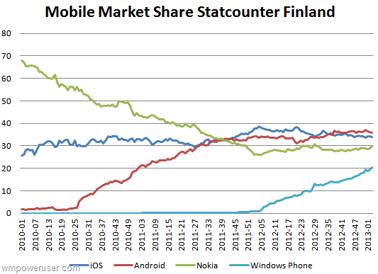 A Statcounter beszámolója szerint Finnországban a Windows Phone platform piaci részesedése 20,24 százalékos szintet ért el, vagyis minden öt eladott okostelefonból egyen a Microsoft új operációs rendszere teljesít szolgálatot. A Windows Phone térnyerése hosszú ideig csak a Symbian eladásokat emésztette fel, ám az alábbi grafikonból is látható, hogy most már az Android és iOS rendszerek térnyerését is stagnálásra váltotta. 2010 elején a Nokia finnországi részesedése közel 70 százalékos volt, mely két év alatt 25 százalékig süllyedt, ám az elmúlt néhány hónapban a regenerálódás folyamata látható, hiszen a gyártó kombinált részesedése már ismét 29,66 százalékon áll. Más régiókban a Lumia és Asha eladások növekedése ennyire nem szembe tűnő, de szinte minden régióban megfigyelhető a piaci bővülés.