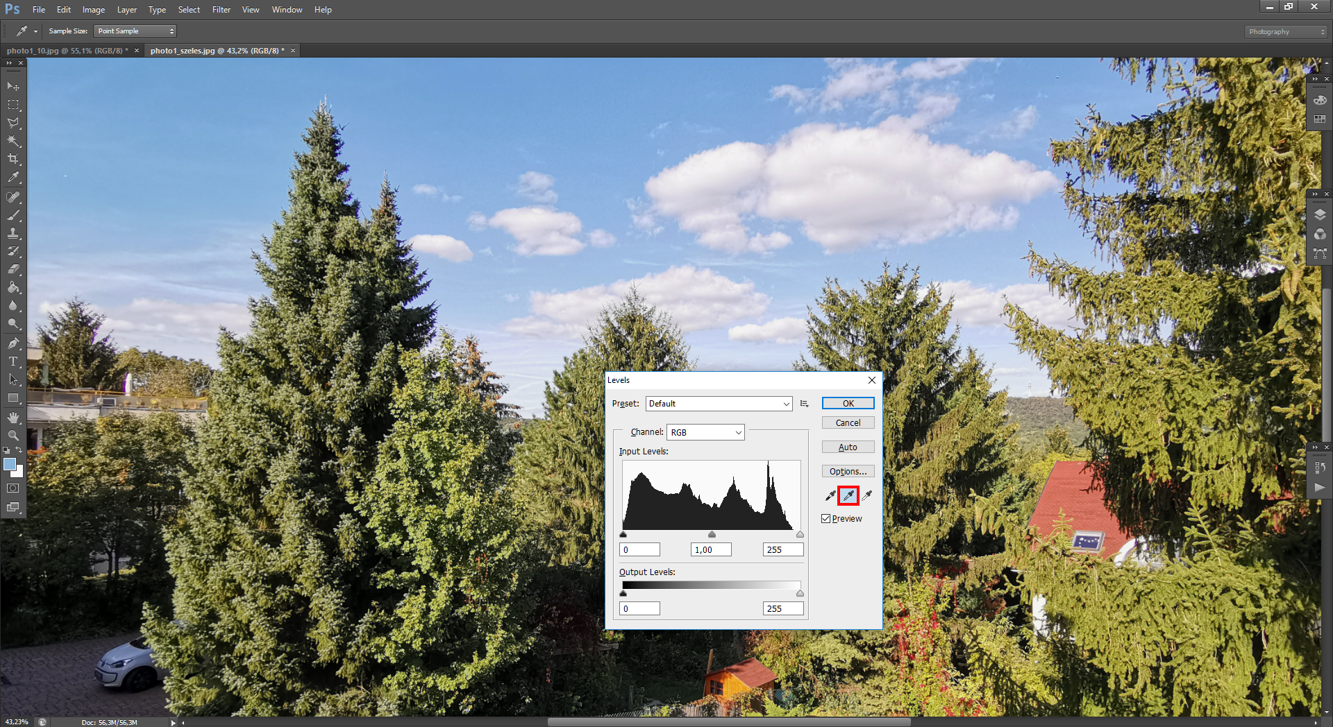 PC-n, Photoshopban a szintek fülön (Windowsban: Ctrl + L), a középső pipettával a kép megfelelő részére bökve lehet a szürke/fehér pontot kiválasztani. A legjobb minőség érdekében a színegyensúlyt persze a DNG RAW nyersfájl behívásakor érdemes módosítani, csatornánként további finomításra is van lehetőség, bővebben itt írtunk a témakörről.