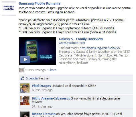 A Samsung romániai részlege a Facebook oldalán hivatalosan is megerősítette a Galaxy S, I5500 és I5800 frissítésének érkezését, melyekre valamikor március végéig sor kerülhet. A közösségi oldalon olvasható bejegyzés szerint a Galaxy S számára március 20-án lesz elérhető az Android 2.2.1 frissítés, melyet a hónap végén az Android 2.3 Gingerbread kiadás is követni fog. Az I5500 Galaxy Europa és I5800 Galaxy Apollo számára pedig az Android Froyo frissítés kerül kiadásra valamikor a hónap utolsó napjaiban. Egyelőre nem tudni, hogy a Románia számára bejelentetett frissítésekkel együtt mely további régiókban lesz elérhető a készülékek új szoftvere.