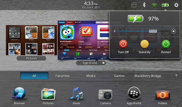 Számos kényelemnövelő funkcióval érkezik a QNX alapú BlackBerry PlayBook legújabb szoftvere, mely habár néhány komoly hibára is gyógyírt kínál, sajnos a legfontosabb hiányosságok továbbra sem kerültek befoltozásra. Az 1.0.5 verziójú firmware telepítését követően lehetőség nyílik alkalmazáson belüli vásárlások és előfizetések lebonyolítására, illetve az akkumulátor töltöttségi állapotát jelző ikon megérintésével a kijelző fényerejének állatásán túl a készülék újraindítása és leállítása is megoldható. Az immáron kikapcsolt állapotban is tölthető táblagép automatikusan figyelmeztet a nem megfelelő microUSB töltők csatlakoztatásakor is, mely esetén a töltési folyamat nem kezdődhet meg. Komoly frissítést kapott a videócsevegés funkció is, mely mostantól nyilvános és céges WLAN hálózatokból is akadálymentesen üzemel, illetve a közelben található vezetékmentes hálózatok detektálása is kifinomultabbá vált. További újdonság a francia, holland, német, olasz, spanyol és brit angol nyelvek támogatása, melyeket hamarosan számos új nyelvi csomag is követni fog.