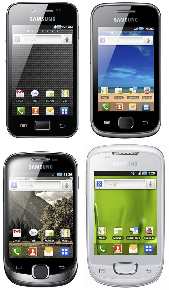 Négy újabb Android 2.2 Froyo alapokon nyugvó készüléket mutatott be a Samsung, melyek közül kettő HVGA, a másik kettő pedig QVGA felbontású megjelenítőt kapott. A kvartett legerősebb tagja a néhány kémfotón már korábban is látott 112,4x59,9x11,5 milliméteres és 113 grammos Galaxy Ace S5830 lett, mely 3,5 hüvelykes, 320x480 képpontos kapacitív multitouch érintőkijelzőt, QVGA felbontású videók rögzítésére alkalmas 5 megapixeles kamerát, GPS, WLAN (802.11b/g/n) és sztereó Bluetooth 2.1 modult, 7,2 megabites HSPA átviteli képességet, RDS FM rádiót, 800 MHz-es Qualcomm QCT MSM7227-1 processzort, 158 MB belső memóriát, előre telepített 2 GB-os microSD kártyát, valamint 11 óra beszélgetést biztosító 1350 mAh kapacitású akkumulátort kapott. A 110,5x57,5x12,2 milliméteres Galaxy Gio S5660 a 3,2 hüvelykes érintőkijelzőjét és a 3,2 megapixeles kameráját leszámítva technikai fronton mindenben megegyezik a sorozat legfejlettebb tagjával.