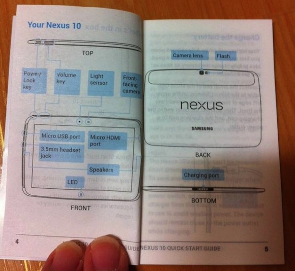Rohamosan közeleg a Google október 29-i sajtótájékoztatója, melyen az előzetes pletykák szerint két új referenciagépről is lehull majd a lepel. Az állítólagosan LG gyártmányú Nexus 4 mellett a Nexus 10 névre hallgató táblagép is valószínűleg bemutatásra kerül majd, melyet a Samsung készít. A kézkönyv alapján a formaterv merőben eltér az Asus által összerakott Nexus 7 külsejétől, inkább a Galaxy Note 10.1 és Galaxy Tab 10.1 készülékekre hajaz. Sajnos a specifikációkról nem szól a fáma, ám a füzetecske alapján egy microUSB-port, egy microHDMI-aljzat, egy speciális töltőcsatlakozó, egy állapotjelző LED, egy hátsó és egy előlapi kamera és egy 3,5 milliméteres kimenet megléte borítékolható.