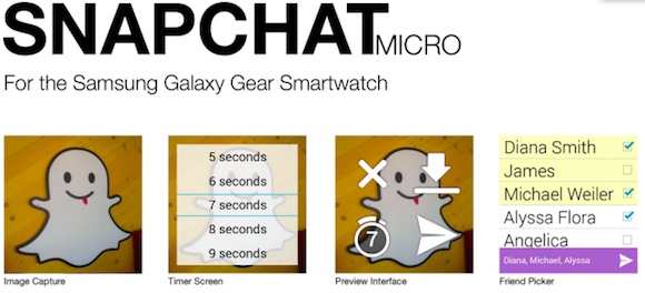 A berlini IFA kiállításon bemutatott Galaxy Gear okosóra egy beépített kamerával rendelkezik, mellyel 1,4 megapixeles fotókat és 720p felbontású videókat lehet rögzíteni. A karóra indulásakor körülbelül 70 alkalkalmazásra lehet majd számítani, melyek mellé most a Snapchat is betársult a Snapchat Micro névre hallgató kezdeményezéssel. A program a felvételek elkészítésére és a megosztásra fókuszál majd, tartalomfogyasztásra továbbra is a hagyományos, azaz telefonos és táblagépes alkalmazások szolgálnak majd.