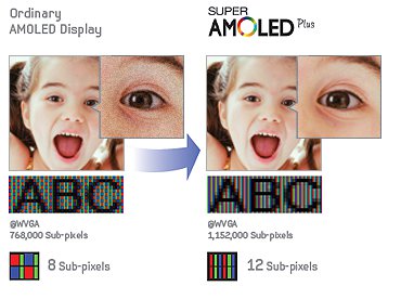 A pentile mátrix RGBG típusú volt, azaz egy piros és egy kék mellé két zöld alpixel került, szemben a klasszikus RGB mátrix RGB felosztásával, ahol mindhárom színnek egy-egy alpixel felelt meg. A felbontást viszont a zöld supbixelek határozták meg, így egy 800 x 480 pixeles pentile mátrixos kijelző összesen 800 x 480 x 2, azaz 768 000 alpixellel operált, szemben a Galaxy S II kijelzőjében is használt RGB mátrixszal, amely 1 152 000 subpixelt mondhat magáénak, amely pontosan 50 százalékkal több az elődben használt technológiánál. Emiatt a Galaxy S kijelzőjén tapasztalható sávosodás eltűnt, a néhol szemcsés képet pedig tűélesre cserélte a Super AMOLED Plus.