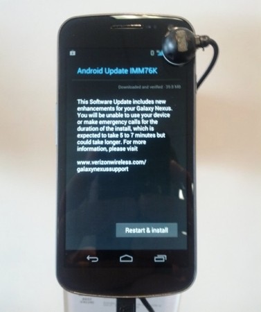 Az amerikai Verizon Wireless CDMA hálózatához tervezett Galaxy Nexus számára is elérhetővé vált az Android 4.0.4 Ice Cream Sandwich rendszerfrissítés, mely elsődleges célja a gyakori hálózatvesztési és csatlakozási hibák javítása lesz. Az IMM76K jelzésű, 39,8 MB méretű firmware ennek megfelelően a modemvezérlés javítása mellett csak apróbb ráncfelvarrásokat tartalmaz. A fenti javítócsomag a nemzetközi HSPA+ változathoz nem kerül kiadásra, mivel azokat nem érinti a CDMA és EV-DO hálózatkezelési probléma. Az európai változatok hibáira korábban az IMM76I verzió jelentett gyógyírt.