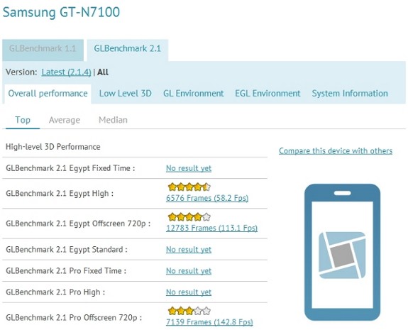 A GLBenchmark eredményei között nemrég felbukkant egy GT-N7100 sorszámú Samsung készülék, mely az előzetes információk szerint az N7000-es sorszámú Galaxy Note közvetlen utódja lehet. Ennek némiképp ellentmond azonban a jövevény képernyőjének 720x1280 képpontos felbontása, hiszen már az elődje is 800x1280 pixeles panellel bírt, vagyis a belső azonosító ellenére is fenntartásokkal kell kezelni az amúgy triviálisnak tűnő közvetlen kapcsolatot. Az elért eredmények és a műszaki paraméterek kapcsán azonban mindenképp egy rendkívül erős ajánlatra lehet számítani, melyben 1,6 GHz-es órajelen futó négymagos Exynos 4412 processzor teljesít majd szolgálatot, lepipálva még a Galaxy S III teljesítményét is.