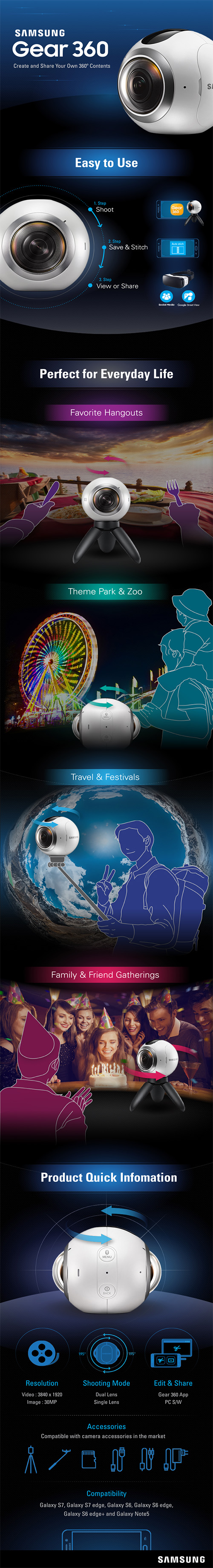 Nem túlzás azt állítani, hogy a 2016-os MWC virtuális valóság lázban égett, sorok kígyóztak a HTC Vive-ot kipróbálni, az LG saját beépített kijelzős VR-szemüvegét promózta, a Samsung pedig részeben a Gear VR segítségével leplezte le a Galaxy S7 és az S7 edge készülékeket, illetve bemutatta 360-as kameráját is, amely két nagylátószögű lencséjének segítségével teljes értékű gömbfotókat készít akár 30 megapixelen, illetve gömbvideókat közel 4K felbontáson. A felhasználó kompatibilis okostelefonjával tudja az Gear 360-at szinkronizálni, jelenleg az alábbiak valamelyikével: Galaxy S6, S6 edge, S6 edge+, Note5, S7, S7 edge. A VR-kompatibilis kamera még nincs a piacon, a második negyedévre várható, és addig az ára is kiderül. A Samsung most infógrafikával szemlélteti, hogy mikor és hol lehet majd hasznos kiegészítő gömbfotók vagy gömbvideók rögzítésére. Az eszköz egyébként 66,7 x 56,2 x 60 milliméteres, 153 grammot nyom, három lábbal támasztható le, 1350 milliamperórás telep táplálja energiával és NFC, WiFi 802.11a/b/g/n/ac, USB 2.0 és Bluetooth 4.1 kapcsolatokkal lett felszerelve. A Gear 360-at IP53-as védelem borítja és van egy apró, 72 x 32 pixeles AMOLED kijelzője.