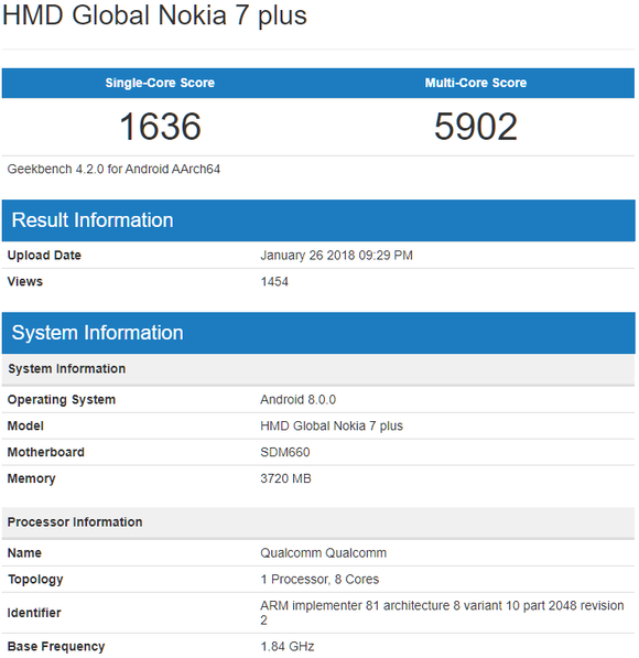 Az októberben bejelentett Nokia 7 eddig ugyanis leginkább Ázsiában volt elérhető 5,2"-es Full HD kijelzőjével és Snapdragon 630-as SoC-jével, ám már készül más kontinensekre is (az amerikai FCC-hez például már ellátogatott), és erre az alkalomra felturbózhatják a hardverét. Egy eddig ismeretlen és hitelességét meg nem erősíthető eszköz ugyanis a jóval erősebb, 660-as Snapdragonnal járt a Geekbench teljesítménytesztjén, 4 GB RAM kíséretében, immáron 8.0-s Androiddal. Ez a modell a Nokia 7 Plus nevet viseli, és nyilvánvalóan az eredeti modell ütősebb kiszerelése lehet.