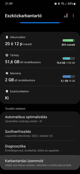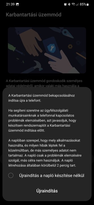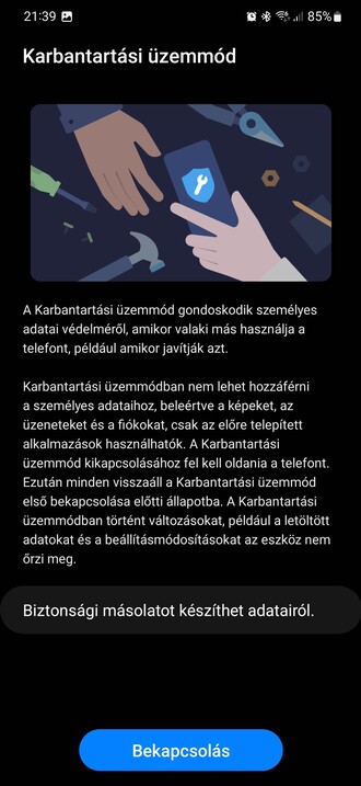 Mostantól viszont személyes adatainkat és tartalmainkat elzárhatjuk, a Karbantartási üzemmód bekapcsolásával pedig amolyan szervizkörnyezetet biztosíthatunk a szakembereknek, akiknek a telefont javításra átadjuk. Így ők egy tiszta szoftverkörnyezetet kapnak, míg saját adataink a telefonon, elzárva maradnak. A művelethez a Beállításokon belül be kell lépni az Eszközkarbantartóba, ott alul a Karbantartási üzemmódot kiválasztani, opcionálisan az adatokról biztonsági másolatot menteni, majd az új módot bekapcsolni, amivel a rendszer újraindul és belép.