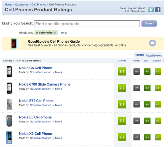 Az elmúlt időben a legtöbb nagyobb gyártó előrukkolt már látványosan környezetbarát mobiltelefonokkal, melyek zöme biológiailag könnyebben bontható, újrahasznosított műanyagokból készültek és általában kisebb méretű, szójafestékkel nyomtatott újrahasznosított papírdobozban kerültek piacra. A GoodGuide felmérése szerint az 576 vizsgált készülék közül az első 26 helyezett mindegyike a Nokiától származik, noha a finn óriás egyetlen készülékét sem kiáltotta ki „zöld” mobilnak. Dara O'Rourke, a Berkeley Egyetem környezet és emberjogi professzora által 2007-ben útjára indított oldal élettani, környezetvédelmi és szociális szempontok alapján sorolja be a műszaki cikkeket, vagyis az oldal a hosszútávú fenntarthatóság jegyében az energiahatékonyság és újrahasznosíthatóság mellett az alkalmazottakkal való bánásmódot is figyelembe veszi.