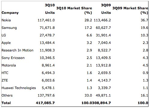 Az IDC után a Gartner is elkészítette a júliustól szeptemberig tartó negyedév kiértékelését, ám a két piaci elemzés ezúttal köszönő viszonyban sincs egymással, ugyanis a Gartner szerint a kisebb gyártók jóval nagyobb teret hódítottak, mely a három legnagyobb gyártóra volt leginkább rossz hatással. A beszámoló szerint a Nokia részesedése egyetlen év alatt 8,5 százalékot esett, így 28,2 százalékra mérséklődött, ám ezzel együtt a Samsung és az LG is 2,4 illetve 3,6 százalékot veszített, így a piaci részesedése 17,2 illetve 6,6 százalékra csökkent. A Sony Ericsson és a Motorola szintén piacot vesztett, ám az Apple és a RIM jelentősen növelni tudta eladásait így 3,2 illetve 2,9 százalékos piaci részesedéssel a negyedik és ötödik legnagyobb gyártókká nőtték ki magukat. Az IDC elemzése szerint a Nokia részesedése „csupán” 4,1 százalékkal csökkent, de egyelőre nem tudni, hogy a két beszámoló közül melyik áll közelebb a valósághoz.