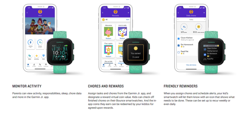 A legtöbb funkció gamifikált, a fitneszkártyák használata, a feladatok elvégzése vagy az aktivitási célok elérése mind jutalommal járnak, a gyűjthető tartalmak mellett játékok és kvízek is elérhetővé válnak, az egyes feladatok virtuális értékét pedig a szülők határozhatják meg. A Garmin Bounce az Egyesült Államokban mutatkozott be és 149 dolláros áron választható, ami jelenleg körülbelül 60 ezer forintot jelent.
