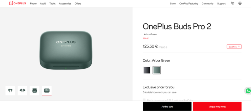 Érdemes azonban ránézni az eredeti Buds Pro 2 árára is, ami jelen pillanatban 30%-os engedménnyel valamivel olcsóbbra sikerült, mint a friss Buds Pro 2R. 179 euró helyett most 125,30 euróért lehet kosárba tenni; a Lite/R verziót meg kicsit zárójelbe, legalábbis amíg a teljes értékű verzióra vonatkozik a kedvezmény. Ráadásul nem csak feketében, de zöldben is választható, ami brand idei karakterszíne.