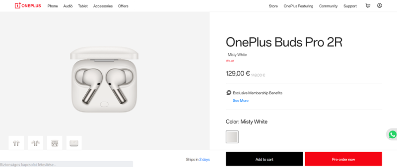 Európába is megérkezett a tavasszal bemutatott OnePlus Buds Pro 2 Lite, annyi különbséggel, hogy csak fehér színváltozatban választható és errefelé Buds Pro 2R-nek hívják. Mondjuk jobban, de legalábbis természetesebben hangzik, mint valami, ami ugyan pro, de mégis lite. Summa summarum, megvásárolható az eszköz, szeptember 25-ig (hétfő) ráadásul kedvezményesen, ami 149 euró helyett 129 eurót jelent, ez körülbelül 50 ezer forint.