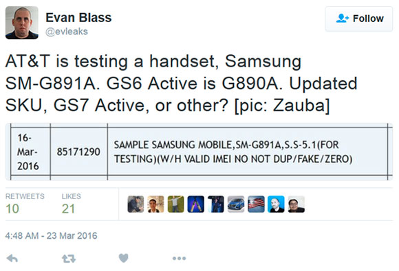 Evan Blass újra akcióba lendült, az indiai termékek beszállítását követő oldal, a Zauba ugyanis listázott egy eddig ismeretlen modellszámú készüléket. Az SM-G891A mindenképpen érdekes, hiszen a Galaxy S6 Active SM-G890A számozással fut, szóval egyáltalán nem kizárt, hogy ennek örököse érkezhet hamarosan. Az @evleaks szivárogtatója azonban azt is hozzátette, hogy érdemes azért fenntartásokkal kezelni ezt az információt, hiszen akár egy más piacra szánt variánst is takarhat.