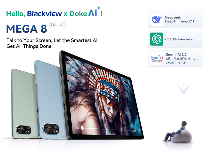 A gépet az Unisoc T620 hajtja, mellette van 12 GB memória és 512 GB beépített, microSD-vel 2 TB-ig bővíthető tárhely. A tárolóból akár 24 GB-ot lehet átcsoportosítani virtuális memóriaként. A tablet Android 15 alapokon futó DokeOS 4.1-es felülettel kerül forgalomba, amibe a márka sajtóközleménye szerint csúcskategóriás AI funkciókat építettek be. A Doke AI integrálja a Deepseek R1, a ChatGPT-4o mini és a Google Gemini AI 2.0 modelleket. A sajtóközlemény szerint az “AI voiceprint recognition” segítségével az ember hangvezérléssel irányíthatja a készüléket, de a csatolt képen látszik, hogy ez egy egyszerű Gemini integráció, ami szinte minden más kurrens androidos eszközön is adott. Emellett a Blackview azt írja, van négy exkluzív AI app is előre telepítve: VidGen, ImageX, Soundle, melyek mind generatív funkciókkal vannak ellátva. Segítségükkel lehet hátteret eltávolítani fotókról, szöveges prompt alapján videót, dalszövegeket vagy dallamokat készíttetni. Ismerve a 12 nanométeres Unisoc T620 specifikációit, ezek több mint valószínűleg nem lokálisan futnak majd. Mindenesetre a Blackview azt mondja, mind saját fejlesztésű program.