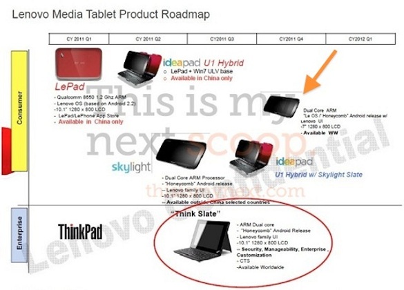 Az alant látható ütemterv szerint a Lenovo idén az üzleti felhasználásra szánt, 10 hüvelykes „Think Slate” internettábla-laptop kombináció mellett egy 7 hüvelykes panellel szerelt táblagép bevezetését is tervezi, melyet a Kínában igen sikeres „Le OS” kezelőfelület tehet egyedivé. Az Android 3.0 Honeycomb alapokon nyugvó készülék az előzetes információk szerint kétmagos Nvidia Tegra 2 processzor köré épül majd és 1280x800 képpontos kapacitív multitouch érintőkijelzőt kapott. A karácsonyi szezon előtt világszerte piacra kerülő Lenovo internettábla várható ára egyelőre nem ismert.
