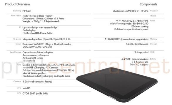 A legtöbb nagy gyártóhoz hasonlóan a HP sem tud vigyázni az üzleti titkaira, így az első webOS alapú internettábla teljes adatlapja két héttel a hivatalos premier előtt nyilvánosságra került. A HP Topaz egyértelműen az iPad közvetlen ellenfele kíván lenni, melyet már a készülék formavilága is elárul. Az adatlap szerint a jövevény 9,7 hüvelykes, 1024x768 képpontos, zsírtaszító bevonattal ellátott kapacitív multitouch érintőkijelzőt, videóhívásokhoz használható előlapi kamerát, 1,2 GHz-es processzort, Adreno 220 grafikus gyorsítót, 512 MB DDR2 RAM-ot, Beats hangrendszert és két, egyenként 3150 mAh kapacitású akkumulátort kapott, melyek együttesen 8 órás üzemidőt biztosítanak. A HP Topaz először csak WLAN modullal ellátott változatban kerül piacra, melyet idővel 3G és 4G modemmel ellátott kiadások is követni fognak.