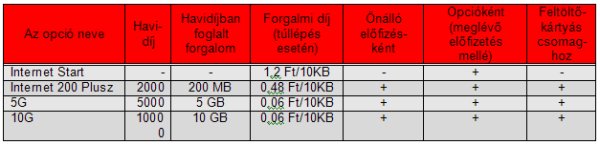 Az internet árak nagyot estek, az eddigi 200 megabájtos csomag mostantól 2000 forintos havidíjért vehető igénybe, de az előfizetők választhatnak az 5G és a 10G nevű ajánlatok közül is, amelyek értelemszerűen 5, illetve 10 gigabájtos adatforgalmat tartalmaznak. Előbbi 5000 forintért, utóbbi 10000 forintért rendelhető meg. Mindezeken felül elérhető a Vodafone Internet Start is, amely havidíjmentes, kizárólag forgalmi díjakkal operáló csomag, itt 10KB adatmennyiség 1,2 forintba kerül. Ez utóbbi ajánlat kivételével mindhárom csomag elérhető a feltöltőkártyás ügyfelek számára is, megegyező díjakkal és feltételekkel.