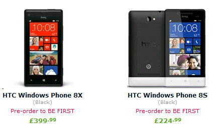 A brit Expansys is felvette a kínálatába a HTC első két, Windows Phone 8 alapokon nyugvó készülékét, melyek közül a 4,3 hüvelykes HD kijelzővel és 16 GB fixen beépített memóriával rendelkező HTC 8X ára 399,99 angol font; a 4 hüvelykes WVGA kijelzővel és microSDHC kártyával bővíthető 4 GB belső memóriával szerelt HTC 8S ára 224,99 angol font körül alakul. A kezdőárak jelen árfolyamon 142 000 és 80 000 forintot jelentenek, mely természetesen tartalmazza a helyi adókat. A Digital-Phone oldalán előrendelhető, és várhatóan október közepétől kiszállítható Lumia 920 előrendelési ára 469,99 angol font lett, vagyis napi árfolyamon 167 000 forint körül alakul. Ez utóbbi ár jóval magasabb a hongkongi online áruházak által említett áraknál, mely oka egyelőre nem ismert.