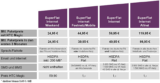 Soon after the launch of HTC Magic in Spain, the German Vodafone has also started sales of the new Google Android handset that has no standard keypad. The smartphone with a 3.2" HVGA (480 x 320 pixels) touchscreen display can be bought at a price as low as 1 euro with an unlimited Internet subscription, the cheapest of these offering unlimited landline or Vodafone calls for 44.95 per month, or free calls to both landlines and Vodafone plus 3,000 text messages and 1,000 MMS messages in the network for 59.95 euros and there is an option for unlimited free calls to all German networks, 3,000 text messages and 1,000 MMS messages to any national network for a monthly fee of 119.95 euros. The cheapest subscription available for the phone costs 24.95 euros per month, includes free calls on weekend and 200 MB of internet traffic, although in this case the handset costs 59.90 euros.