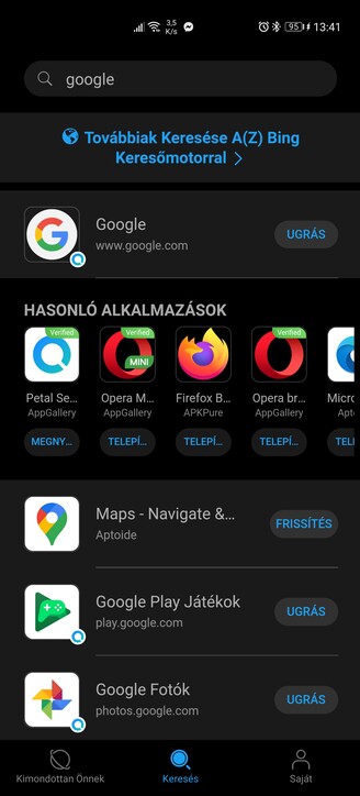Minialkalmazások után szintén lehet kutatni, és a direkt címtalálatok mellett social, azaz közösségi, magyar és más kulcsszavakkal szűrhetünk tematikusan vagy régió szerint. A HMS-es telefonokon futó Google alkalmazásokhoz (Térkép), illetve online elérhető szolgáltatásokhoz is akad link (Keep), illetve alternatív ajánlatok ezek helyettesítésére. A Petal Seach alkalmazáskereső egymilliós listáról gyűjti egybe a legrelevánsabb találatokat, és külön fül alatt részletezi a frissítésre várakozókat, legyen a forrás az AppGallery, az APK Pure vagy az Aptoide.