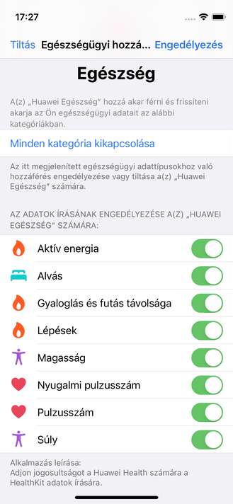 Az adatokat társíthatjuk az Apple Health alkalmazásával, így a Huawei ökoszisztémájából az iOS-ébe is átkerülnek a testadatok, az aktív energia, az alvás és a testmozgás Watch GT-n mért értékei.