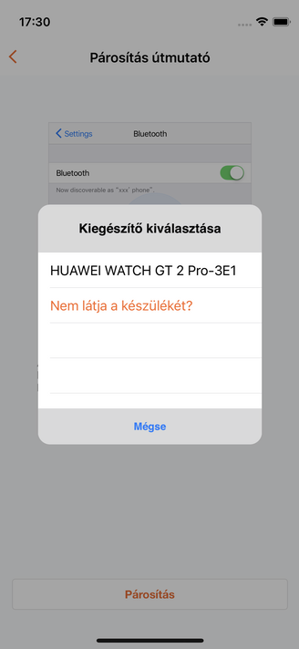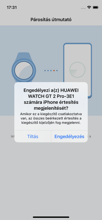 A Huawei Health főoldala fentről ismerős lehet, órát, karperecet, mérleget és pulzusmérőt pedig újfent az Eszközök menüpontban, a jobb felső sarokra bökve tudunk hozzáadni. Ha mindkét eszközön aktív a Bluetooth és kütyünket kiválasztottuk, az iOS megkér bennünket, hogy a telefon Bluetooth beállításaiban párosítsuk őket.