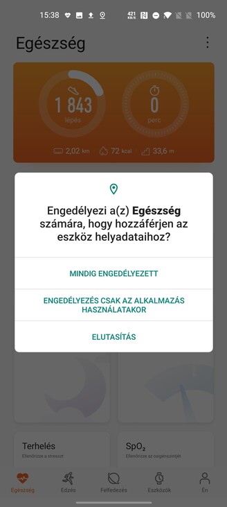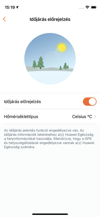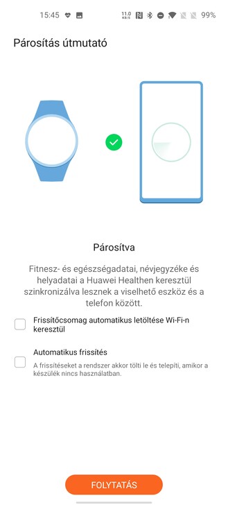 Ha ez megvan, visszatérhetünk a Huawei Egészségbe, ahol a társítási folyamat során meg kell adni az értesítési engedélyeket és a helyhasználatot, ami például az időjárás kijelzésénél jön jól. További fiókinformációk és jogosultságok megadása után máris szinkronizál az óra a telefonnal, és az Eszközök fül alatt elérhetjük a kütyü beállításait, a firmware frissítést és a visszaállítást beleértve.
