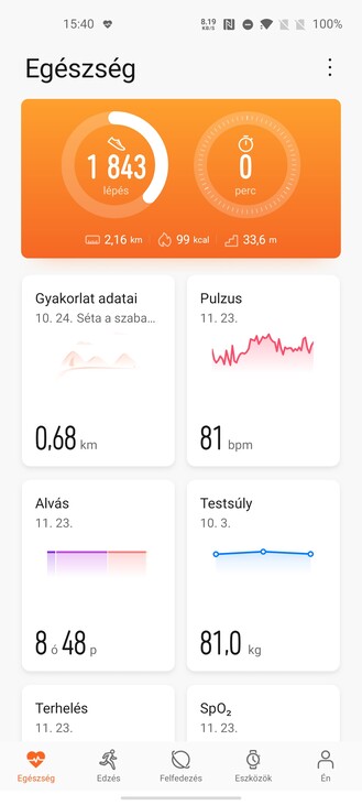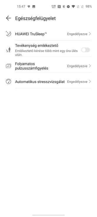 A nyilatkozatok és engedélyek elfogadása, illetve a testadatok megadása után máris szemünk elé társul az Egészség főoldala, rajta a napi mozgásadatok és egyéb statisztikák kártyáival. Ahány kütyü, annyiféle extra statisztika jár, a Watch GT 2 Próval például napi, heti és havi bontásban ellenőrizhetjük lépéseinket, aktív perceinket, edzéseinket, pulzusunkat, véroxigén-telítettségünket, alvásunkat, testsúlyunkat, stressz terhelésünket és nemtől függően menstruációs ciklusunkat.