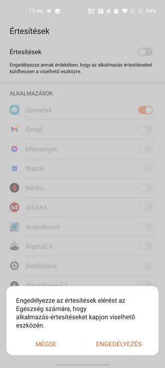 Előbb a telefon beállításai között kell a Huawei Egészség számára engedélyezni az értesítési hozzáférést, majd az Egészségen belül egyesével bepipálhatjuk, melyik alkalmazástól vagy szolgáltatástól kívánunk az órán értesítést fogadni – válaszolni, illetve képeket vagy emojikat megjeleníteni nincs lehetőség. Ezután újabb pár engedélyt kell megadni, beleértve a helyhozzáférést, elvégre ez alapján küld az Egészség az órának releváns időjárásadatokat.