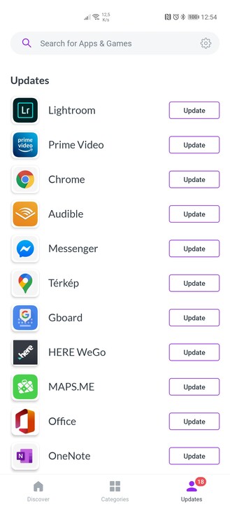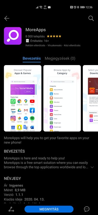 A főoldal alkalmazástippjei mellett 23 témakörön belül böngészhetjük a MoreApps ajánlatait, így ha játszanánk, hírt olvasnánk, mozognánk, vásárolgatnánk vagy ételt rendelnénk, egy csokorba vannak szedve a népszerű megoldások, és természetesen az AppGallery is felnyílik, ha egy-egy alkalmazás onnan is telepíthető (például a Honfoglaló).